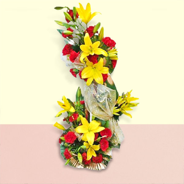 Highlights: 10 Lilies 22 Red Carnations Please Note: As per government rule, non-woven fabric wrapping will be replaced by paper wrapping in Bangalore, Mumbai, Pune, and other cities where non-woven fabric wrapping is prohibited. Green fillers may vary as per the availability.