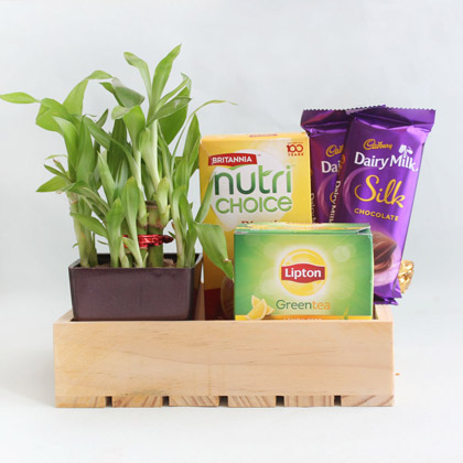 2 Cadbury Silk of 60 gms each 1 lucky bamboo plant potted in a container 1 Nurti Choice of 250gm A pack of Lipton Green Tea (10 packets) A wooden tray