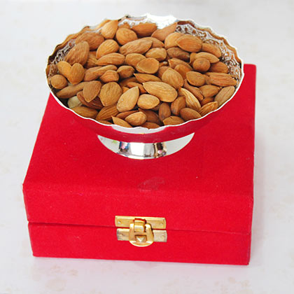 Product Description A bowl so round!! Here is this silver bowl containing almonds and placed on the top of a beautiful box which is red in colour. You can gift this hamper to any of your loved ones on any of their special occasion and make them feel delightfully special. Be it Diwali, Holi, anniversary or birthdays, this gift can make a positive difference to your relationship • 1 Silver Bowl • Almonds of 100gm • 1 red beautiful Box