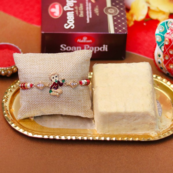 Leave your little brother amazed this Raksha Bandhan by pampering him with this amusing Chota Bheem rakhi gift combo which consists of a Chota Bheem rakhi designer rakhi and delicious Soan Papdi by Haldiram.