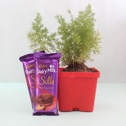 Plant Plant Name: Foxtail Fern Plant Plant Type: Fern Plant Plant Placement: Indoor Plant container: Plastic pot Chocolates 2 Cadbury Silk Fruit N Nut of 60 gms