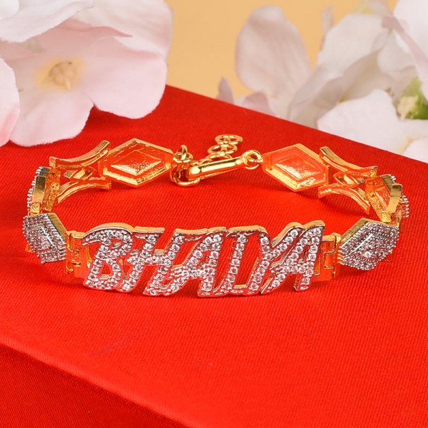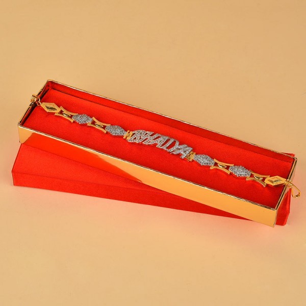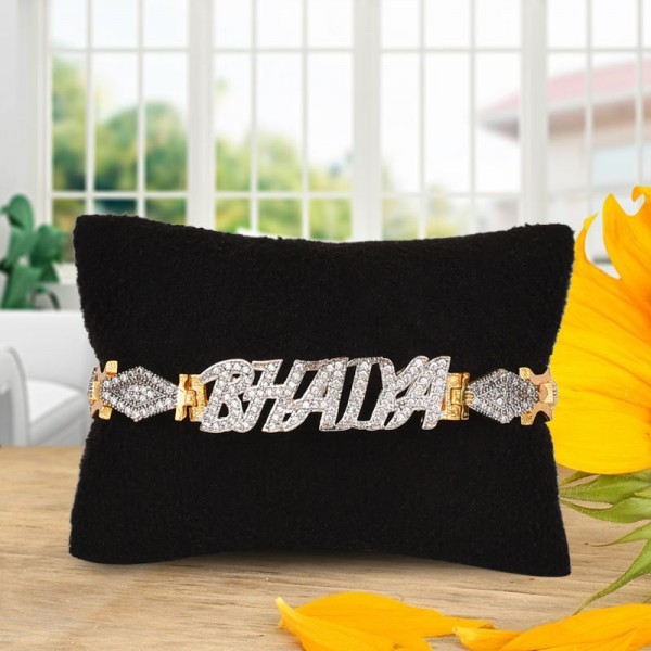 To dazzle up the wrist of your dearest brother, here's something he is sure to love! This bracelet rakhi with 'Bhaiya' written right in the middle is perfect for a stylish brother. The golden chain with it makes this Rakhi an excellent Bracelet to flaunt even after the festival is over!