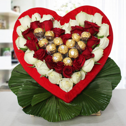 Color of Flowers - Mixed Type of Arrangement –Heart shape basket Number of Stems -35 Red Roses- 15 White roses-20 16 pieces of Ferrero Rocher chocolates Note: The heart shape design can serve as a great home décor item. The green leaves in this arrangement will depend on their availability with the local florists. Flower trivia Red and white rose’s together stand for love and peace and affection. White rose symbolises peace within the relationships
