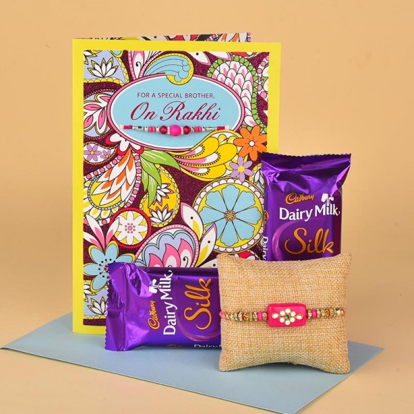 Product Contains: - 1 Designer Rakhi - 1 Greeting Card - 2 Cadbury Dairy Milk Silk Chocolates (60 gms) - Roli and Chawal