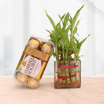 Plant Plant Type: Two Layer Lucky Bamboo Plant Container: Square Glass Vase Type of Plant: Indoor Plant Chocolates A box of 16 Ferrero Rocher chocolates of 200 gmsLucky Bamboo Plant Trivia The origin of the bamboo plant is the tropical rainforests of South-East Asia and Africa. The two layered Lucky Bamboo plant stands for love and double your luck.