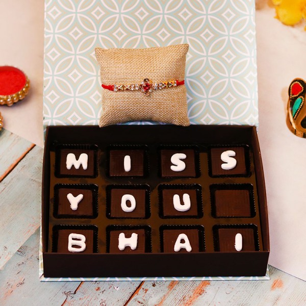 Missing your brother who stays miles away from you? This Raksha Bandhan, ask your brother to meet you soon by sening him this delightful rakhi gift combo consisting of a sparkling gemstone rakhi and a box of delicious handmade chocolates that says "Miss You Bhai".