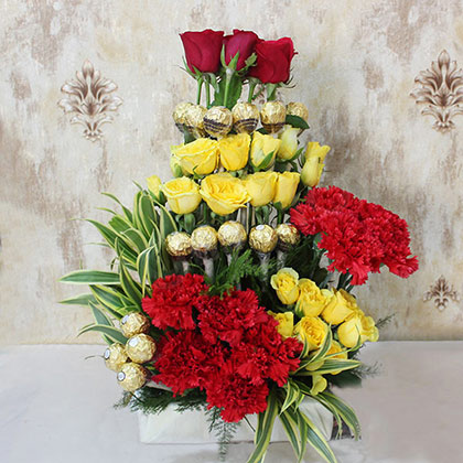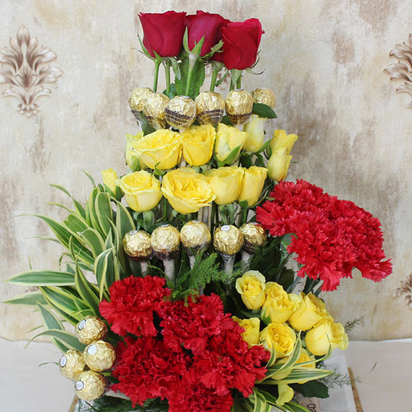 Color of Flowers – Yellow & Red Type of Arrangement – Basket Number of Stems – 30 Yellow roses – 20 Red Carnations – 10 Chocolates - 16 Ferrero Rocher chocolate balls (200 gm) Note: The use of green leaves and fillers in this floral basket depends on their regional and seasonal availability. The Oasis foam in this floral basket stores water and keeps the flowers replenished for a longer time. The flower basket is recyclable in nature.