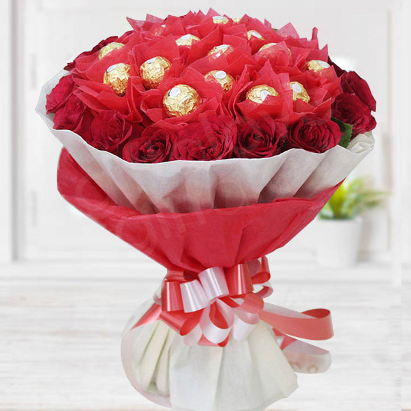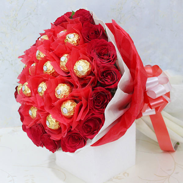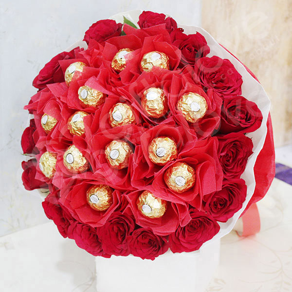 Color of Flowers – Red Type of Arrangement –Bouquet Number of Stems –31 Red Roses- 15 Chocolates - 16 Types of chocolate- Ferrero Rocher Note: Ribbons used in the flower arrangement can be used again. The use of green fillers in the bouquet depends up on their availability and it is also dependent on the season. Flower trivia Roses were considered as the most sacred flowers in Ancient Egypt. The world’s oldest living rose bush is said to be 1000 years old