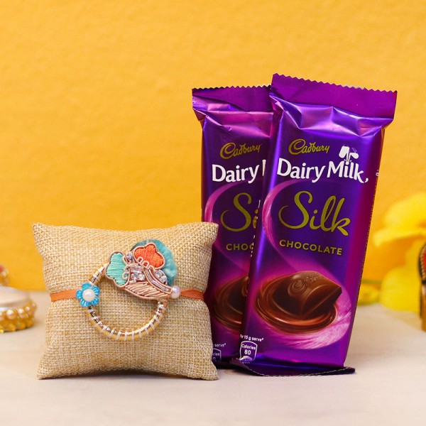 Raksha Bandhan is here, and it's time to treat your dear brother with the sweetest gift. We present you this delightful rakhi gift combo which consists of a beautiful zardosi rakhi and two Dairy Milk Silk chocolates.