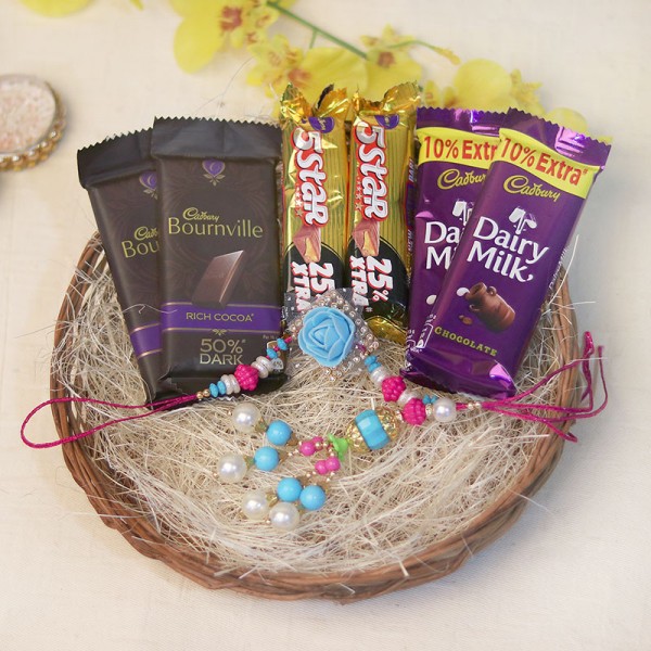A basket to fulfill all your Rakhi chocolate cravings at once. Here is a combo basket with a designer rose Lumba rakhi set for Bhaiya n Bhabhi, 2 Cadbury Bourneville, 2 Cadbury 5Star, and 2 Cadbury dairy milk.