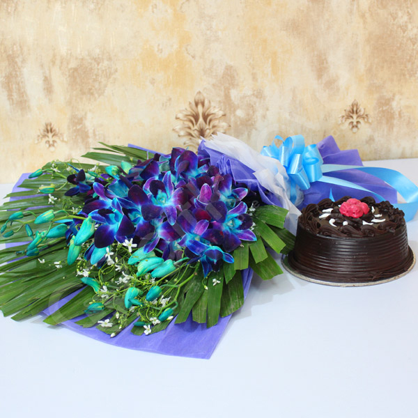 Flowers Color of Flowers – blue Type of Arrangement- bouquet Number of Stems – 6 Orchids- 6 Cake Flavour- chocolate cake Shape- round Serves- 4-6 people Key ingredient- flour, baking powder, sugar, and many more ingredients.