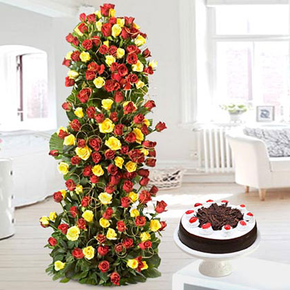 Want to make someone''s day really special? Shop for the perfect arrangement that comes with a perfect mix of red and yellow roses coupled beautifully with a rich black forest cake on the occasion. Product Specification:- Arrangement of 100 Red N Yellow roses of 3-4 ft height with lots of green fillers along with 1kg Black forest cake.