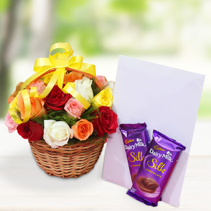 Online gifts delivery - Giftalove 0 Home » Flowers with Chocolates » Vibrant Hamper Vibrant Hamper 1299.00Rs.1399.00Inclusive of all taxes 4.7 3 Reviews Product Overview Flowers Color of Flowers – Mixed Type of Arrangement – Basket Number of Stems – 24 Red roses – 8 Pink roses – 4 Yellow rose – 4 White rose – 4 Orange rose - 4 Chocolates 2 Dairy milk Silk chocolates of 60 gm each Greeting Card 1 greeting card for the required occasion Note: The basket and the colorful ribbon can later be used to keep things of regular use. The green fillers in this flower basket are seasonal and depend on availability in the market. The greeting card can be used to embellish the home decor. Flower trivia There is a massive rose bush that covers the wall of the Cathedral of Hildesheim in Germany for thousand years.