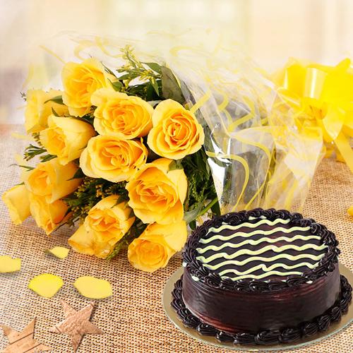 Product Details: 10 Yellow Roses Yellow Paper Packing Yellow Ribbon Truffle Cake- 500 gms Type of Cake - Cream Shape- Round Serves- 4-6 People Size- 6 inches in Diameter
